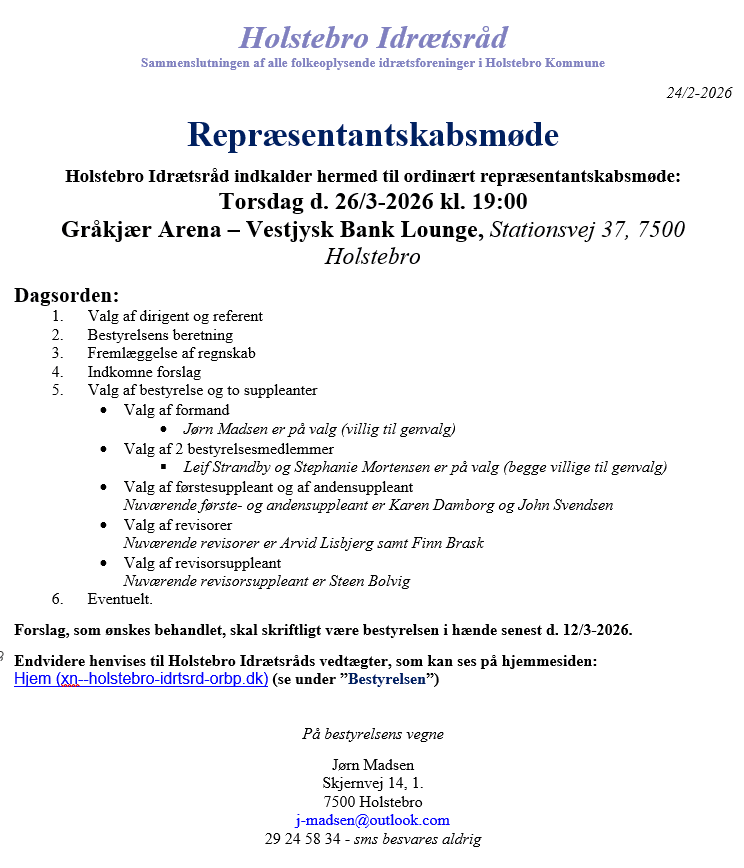 - - være høringsorgan for den samlede idræt i forbindelse med Holstebro Kommunes årlige budgetarbejde